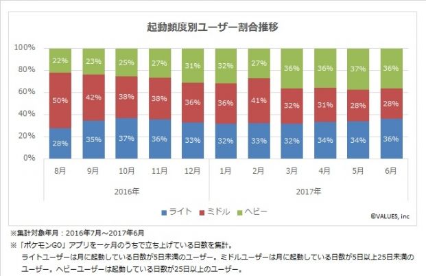 また、ライトユーザーが2016年9月以降、常に3割以上いることから、思いついたときに立ち上げるユーザーや細く長くプレイし続けるユーザーも一定割合いることがわかります。
