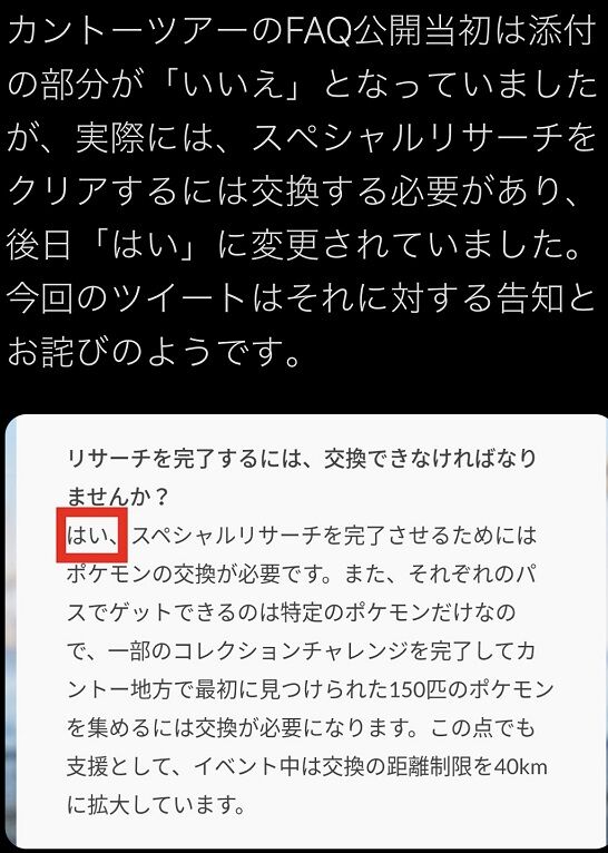 トレーナーの皆さん、「Pokémon GO Tour:カントー地方」に関する「よくある質問」のスペシャルリサーチの交換に関するFAQについて、公開当時の内容に一部誤りがございました。現在は修正されています。混乱をお招きしましたことをお詫びいたします。https://t.co/1vCgl0SDdU — @NianticHelpJP (@niantichelpjp) February 24, 2021